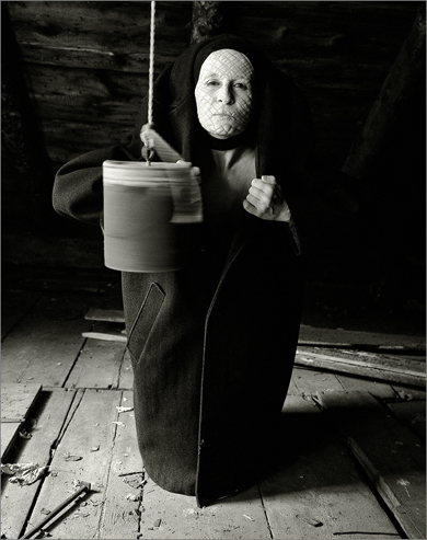 Kitt is a prime member of X-act, which is based in her homeland of Denmark. Her costume and character are from a solo performance titled ‘Stigma’. As spooky as she may seem, behind the makeup and cloak rests a beautiful, kind, focused, and curious woman. Kitt is a self-proclaimed “loner” who’s solo work reflects a deep inner exploration of movement and character. The location is the attic of the ‘Derby House’, an adjacent farm house and property acquired by Jacob’s Pillow which is used to house visiting artists. The foreground object is a rotating paint can filled with cement, which functions as a counterweight for the attic’s trapdoor.